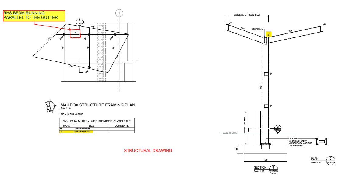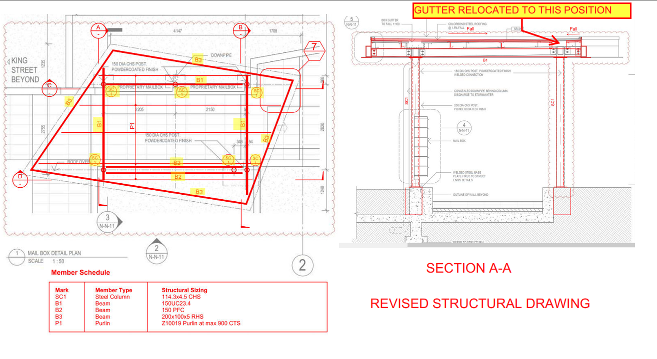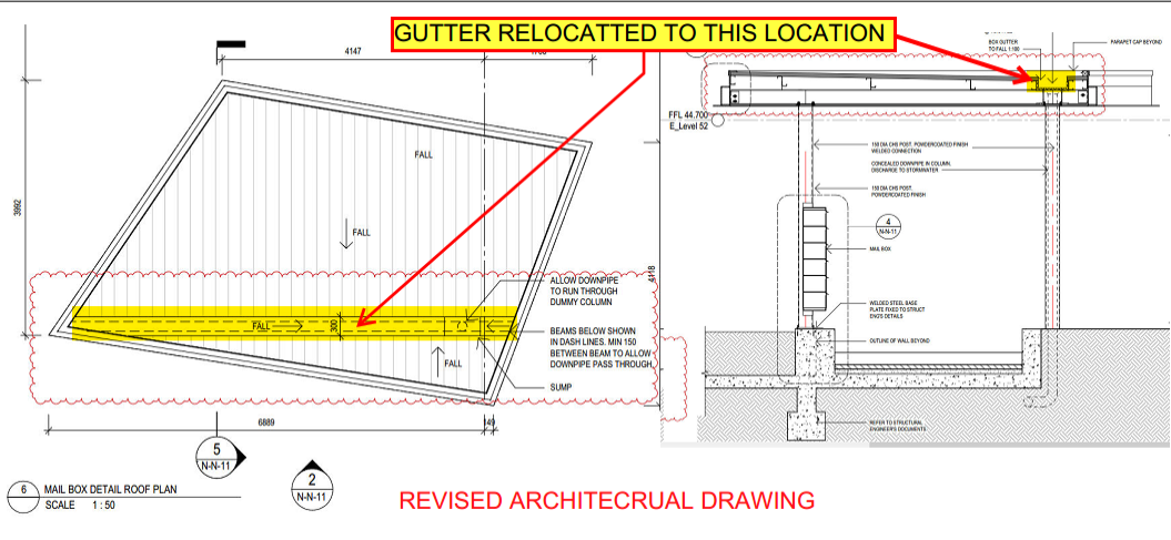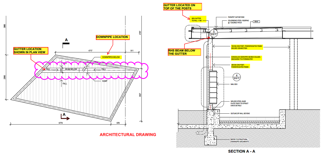 Here, is an example of how the gutter location affects the structure. In this canopy, the gutters sump and downpipe are located over a steel beam. (Refer attached Architectural drawing). The structural engineer did not consider the gutter when designing the steel members. The beam is running parallel to the gutter with a clearance of only 20 mm, which is not sufficient for fixing the downpipe. (Refer Structural drawing).