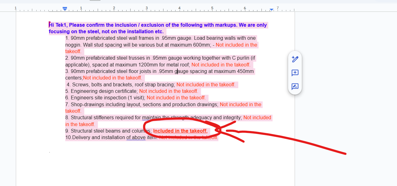 - Terrible. Why? (a) Poor English: First of all the grammar is not clear. What do you mean: “Inclusion”? Does this mean you have included the steel or not? (b) Why Excluded? Secondly the exclusions: any reason why this is excluded? The client is paying you for doing the work, so you need a very good reason to exclude it, or there must be a measure, or a proxy by which you should enable the client to quote. (c) No proof: I want to see markups / snippets PROVING that you have made this inclusions.